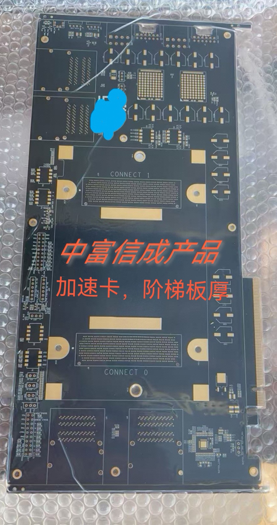 18层阶梯板厚加速卡项目,小批量出货。板厚2.0MM,金手指部分L5-L18层厚度1.6MM.松下R5775G材料。内外层线宽线距3.7mil左右,内层最小空间7mil(孔到内层铜)。L1-18/L5-18层树脂塞孔,10组背钻。